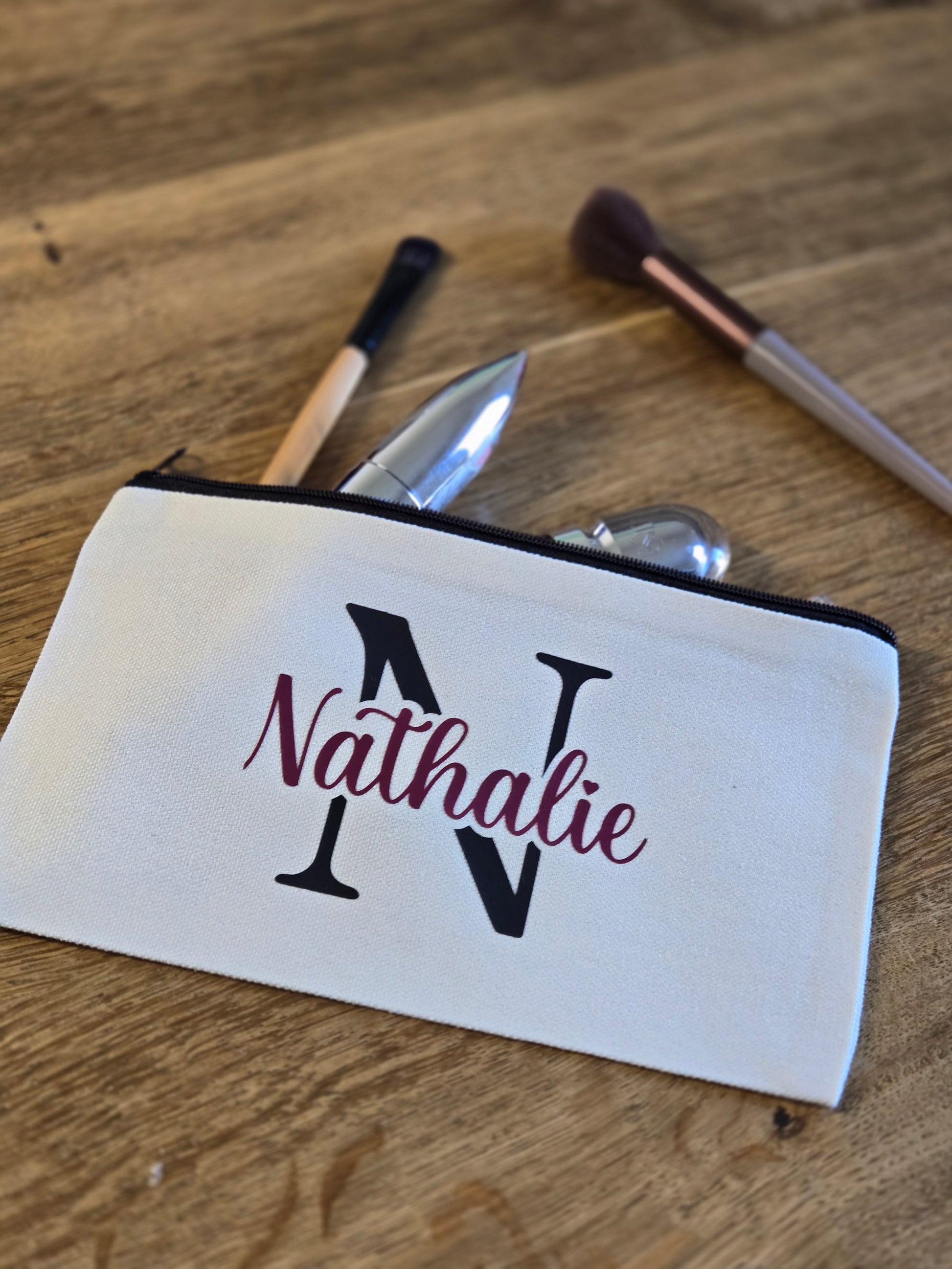 Pochette noire ou beige pour ranger ses petites affaires, personnalisée avec le prénom et son initiale.
