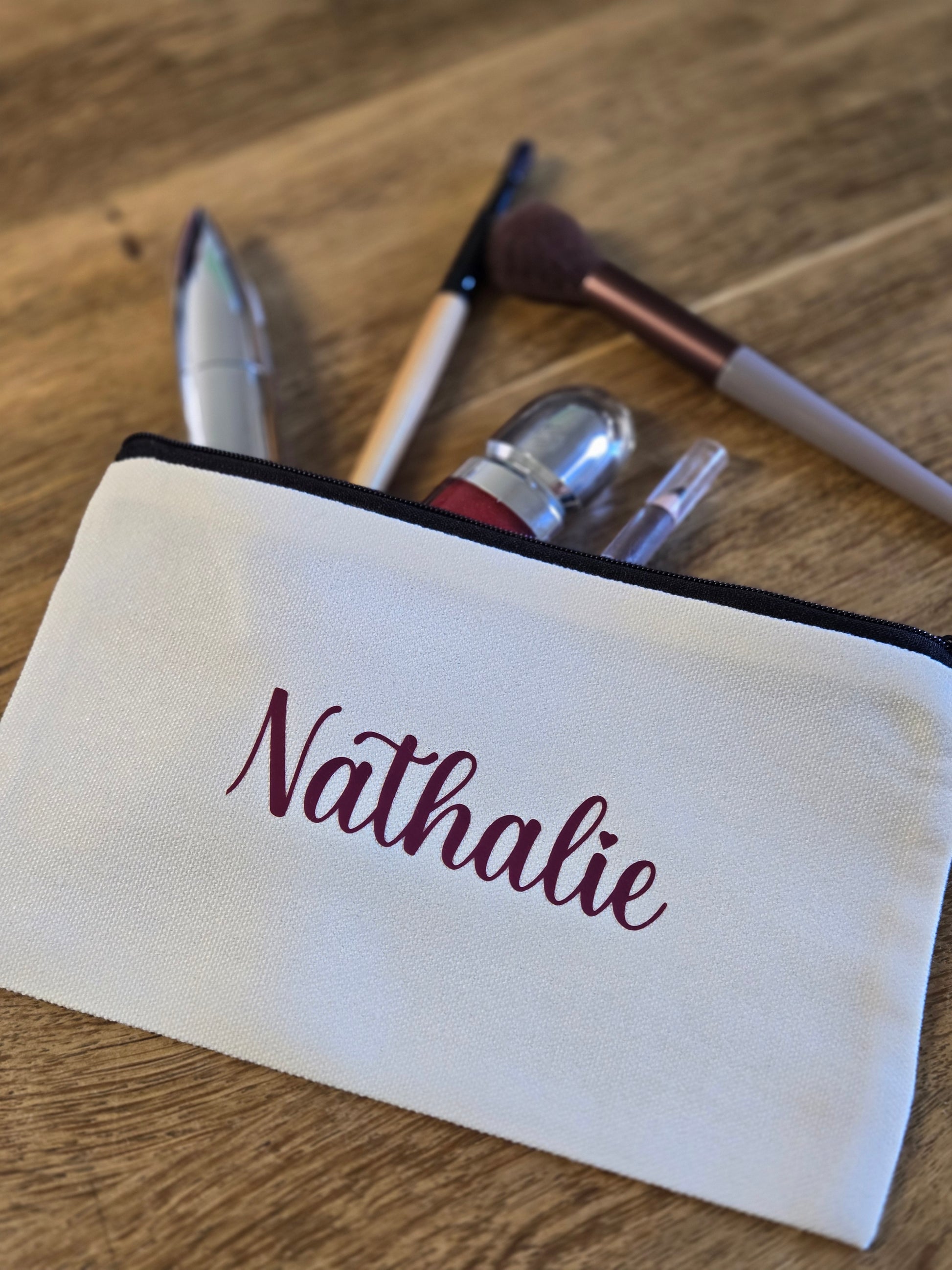Pochette noire ou beige pour ranger ses petites affaires, personnalisée avec le prénom.